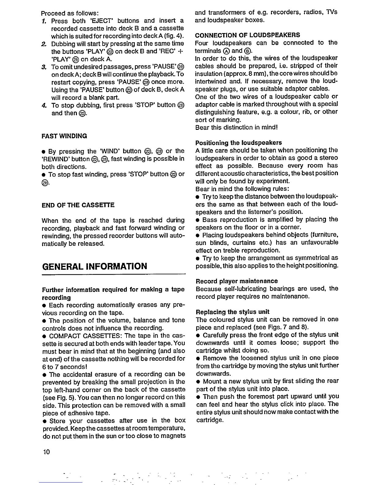 Philips F885 - General Information; Fast Winding; End of the Cassette; Positioning the Loudspeakers