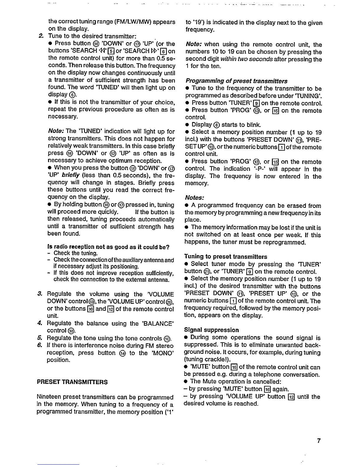 Philips F885 - Preset Transmitters; Programming of Preset Transmitters; Tuning to Preset Transmitters; Signal Suppression