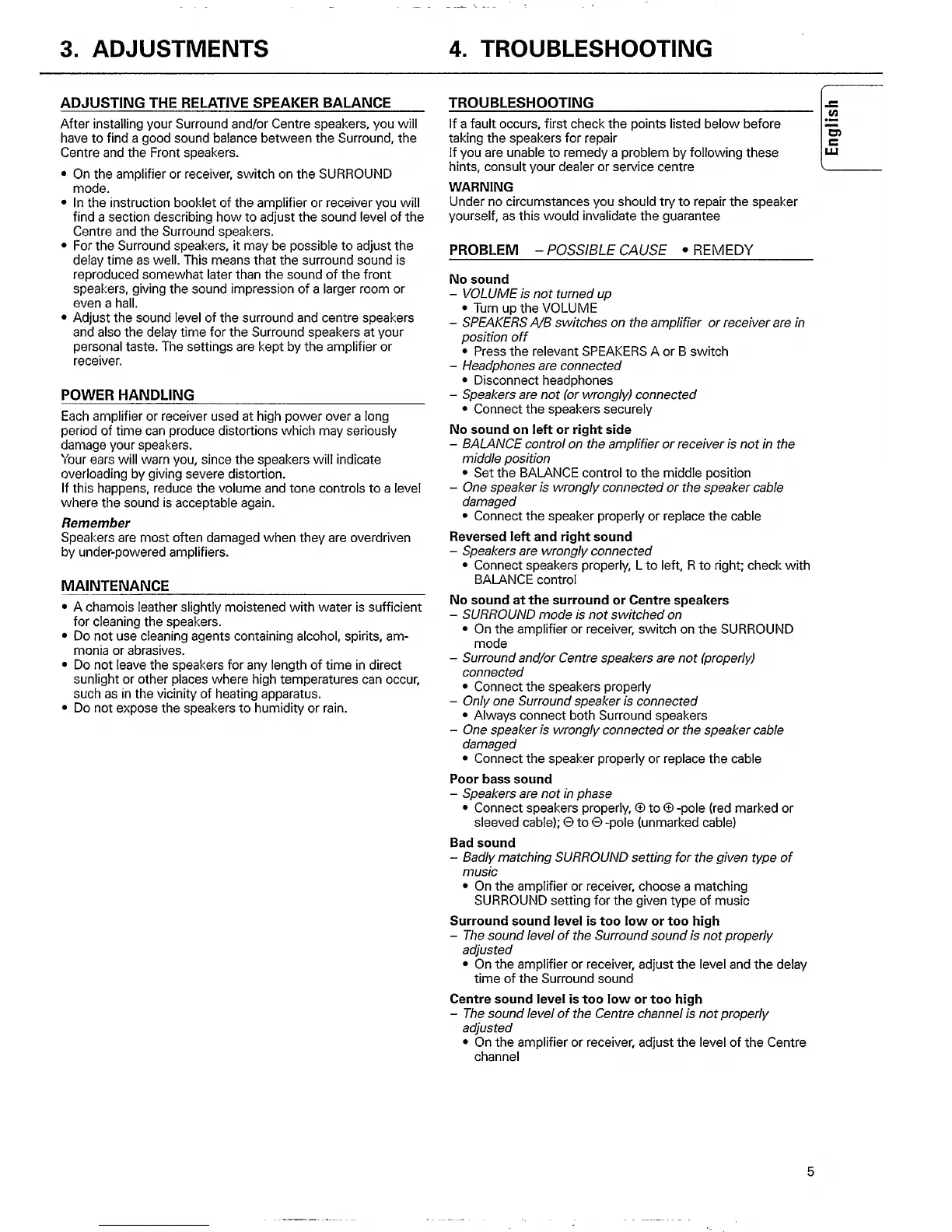 Philips FB 603/00 - Speaker Adjustments and Maintenance; Adjusting Relative Speaker Balance; Power Handling and Maintenance; Speaker Troubleshooting Guide