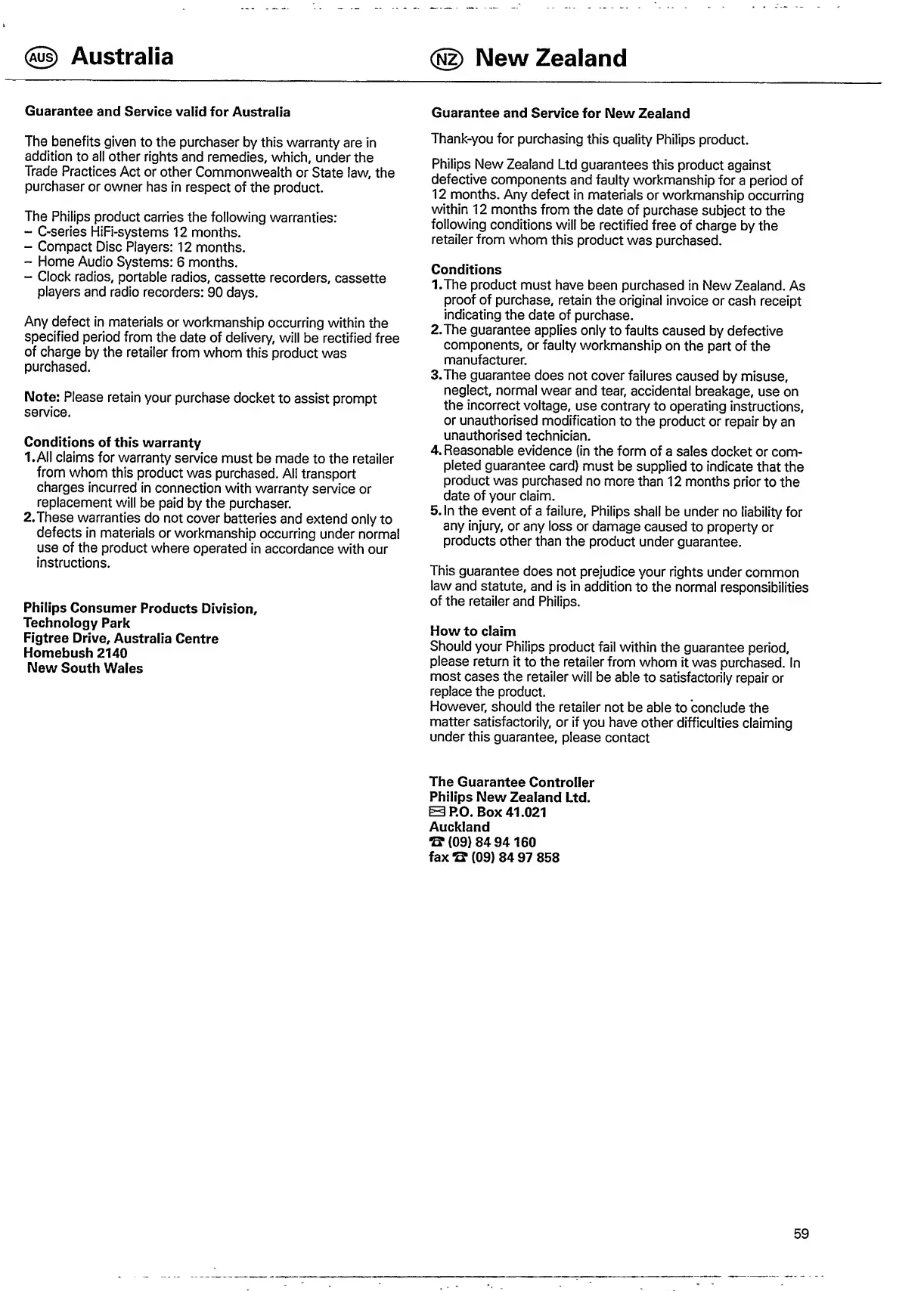 Philips FC 911 - Warranty Information; Australia; New Zealand