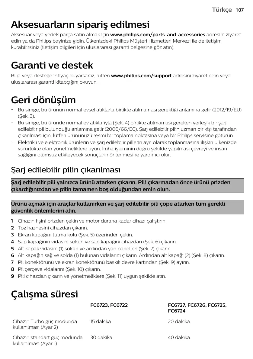 Şarj edilebilir pili yalnızca ürünü atarken çıkarın. Pili çıkarmadan önce ürünü prizden