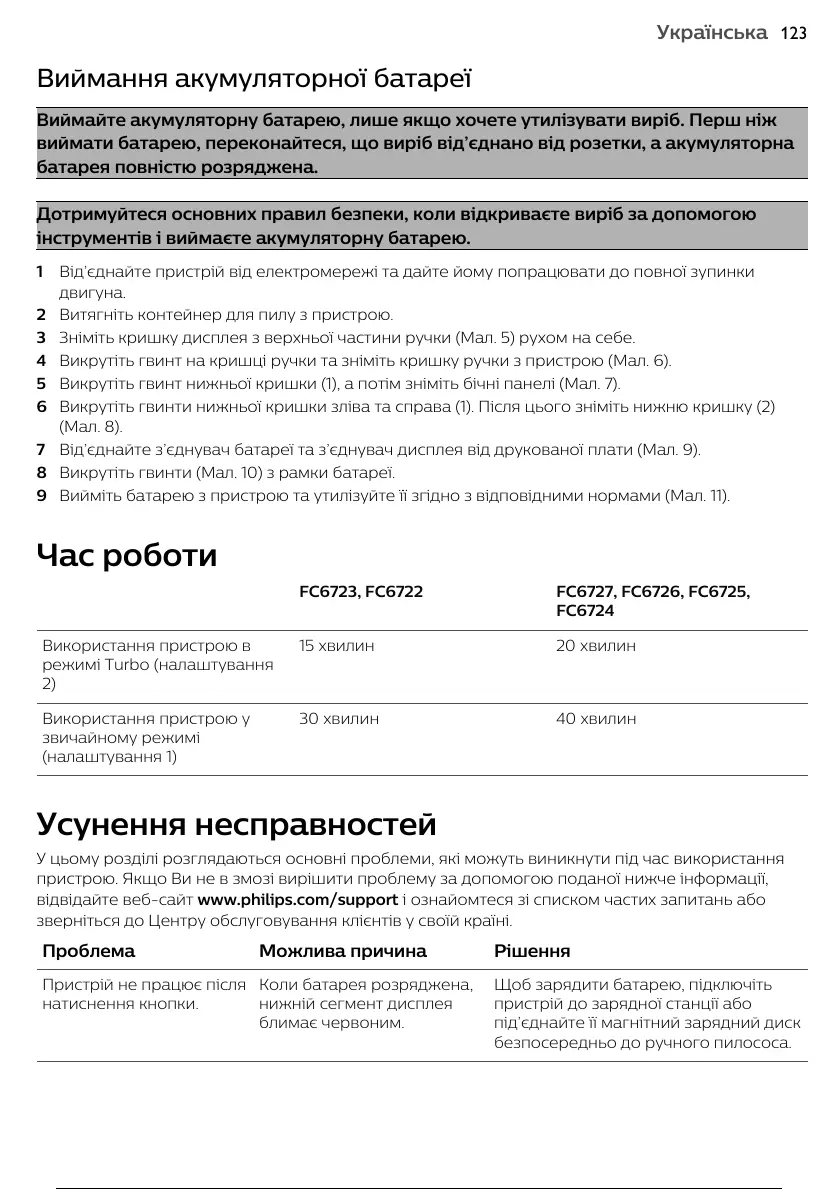 виймати батарею, переконайтеся, що виріб від’єднано від розетки, а акумуляторна