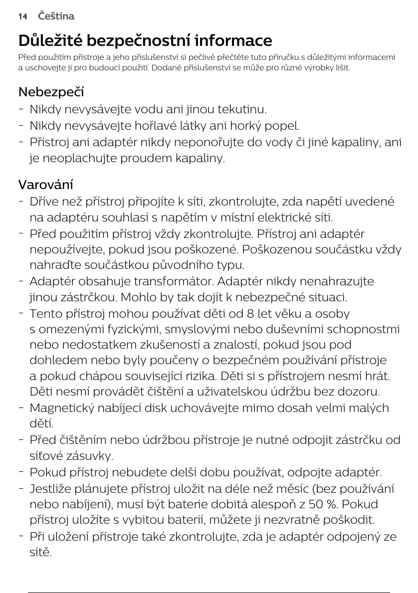 Přístroj ani adaptér nikdy neponořujte do vody či jiné kapaliny, ani