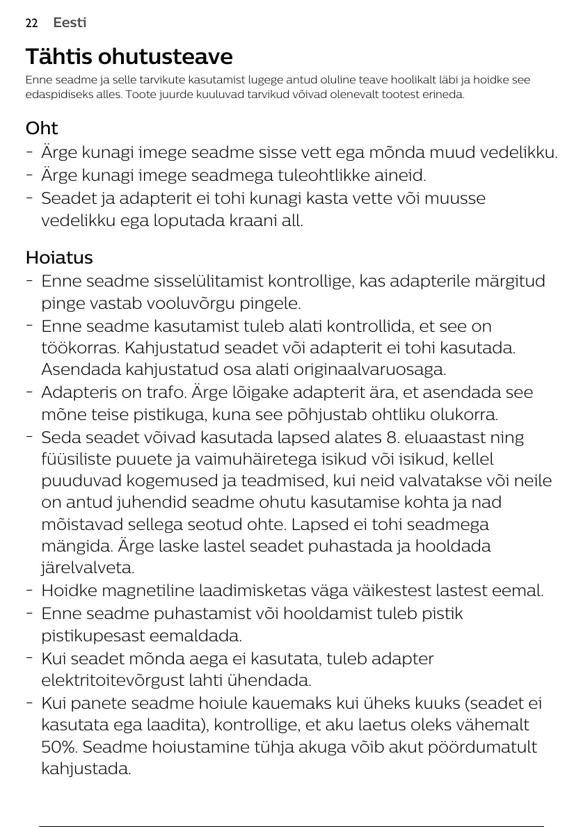 Seadet ja adapterit ei tohi kunagi kasta vette või muusse