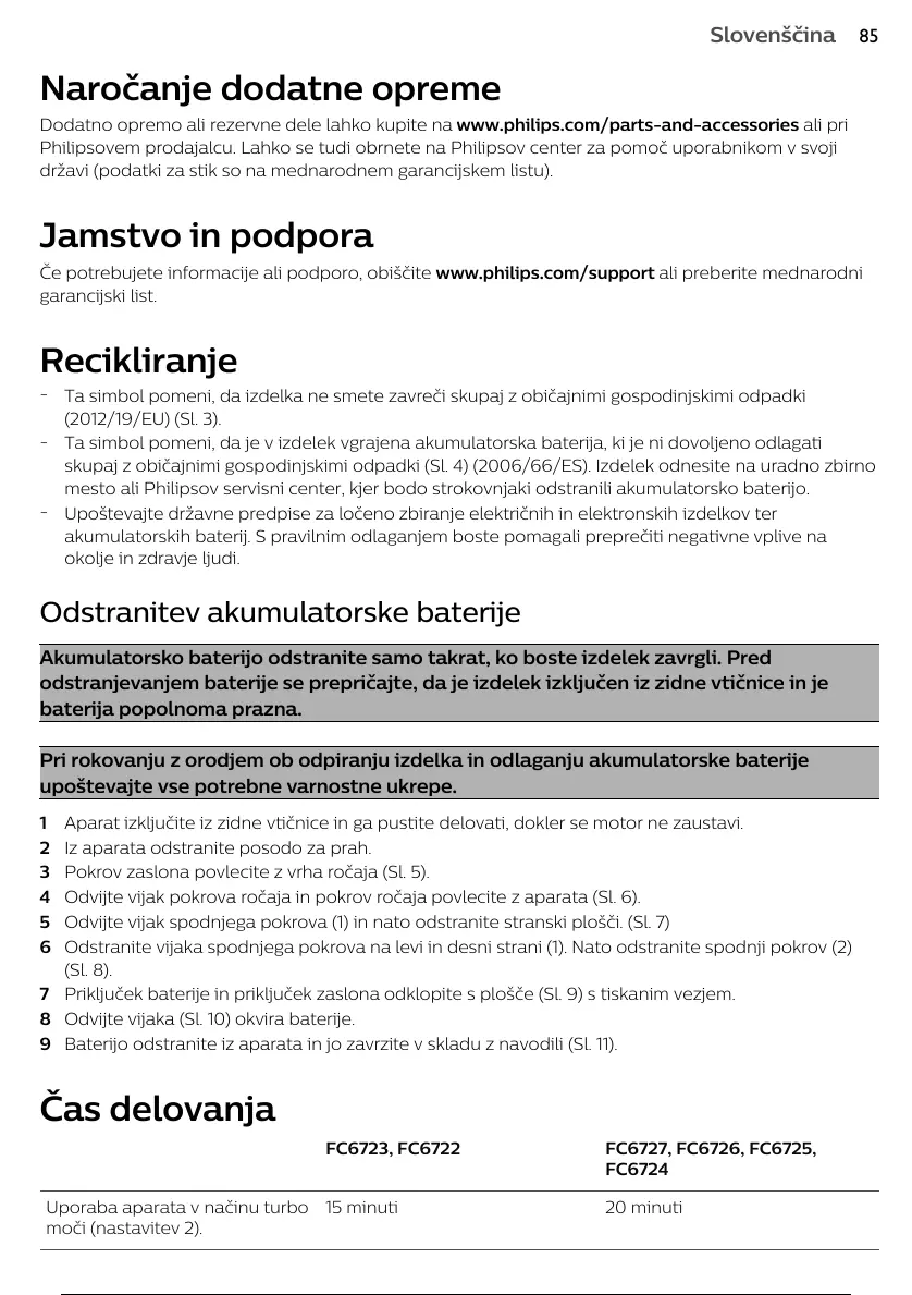 mesto ali Philipsov servisni center, kjer bodo strokovnjaki odstranili akumulatorsko baterijo.