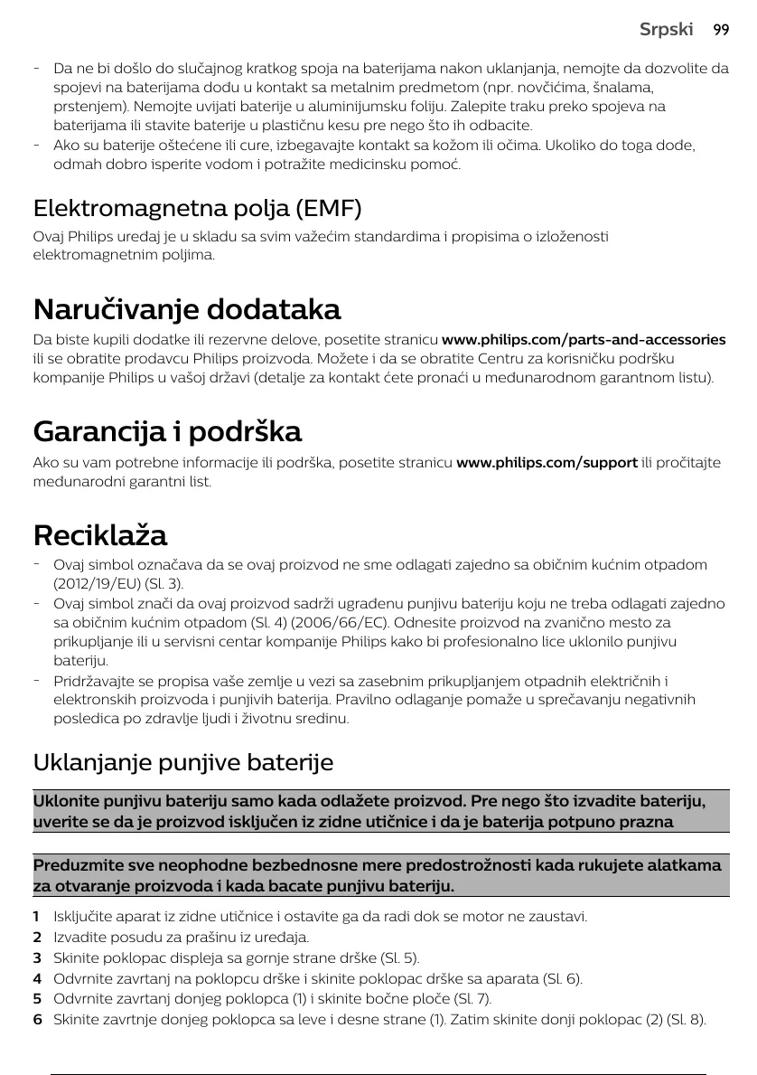 prikupljanje ili u servisni centar kompanije Philips kako bi profesionalno lice uklonilo punjivu