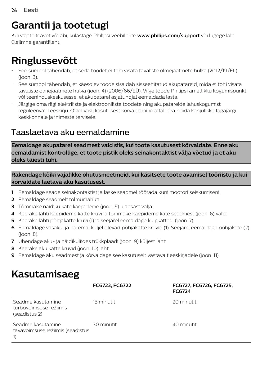 Eemaldage akupatarei seadmest vaid siis, kui toote kasutusest kõrvaldate. Enne aku