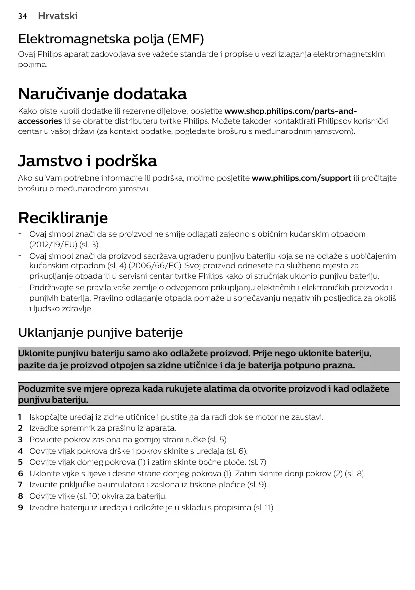 prikupljanje otpada ili u servisni centar tvrtke Philips kako bi stručnjak uklonio punjivu bateriju.