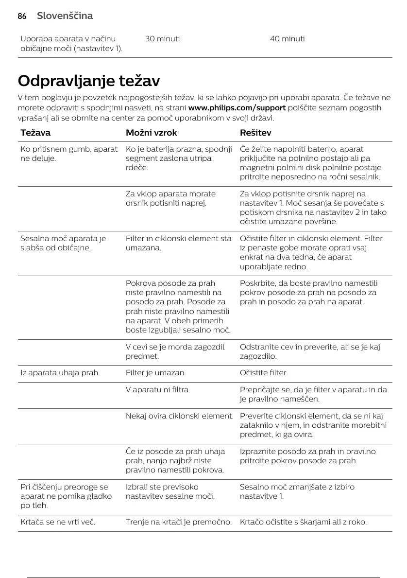 morete odpraviti s spodnjimi nasveti, na strani www.philips.com/support poiščite seznam pogostih