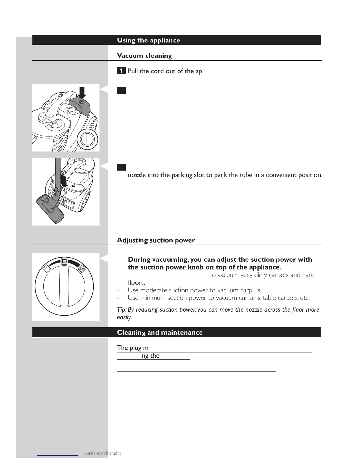 - Use minimum suction power to vacuum curtains, table carpets, etc.