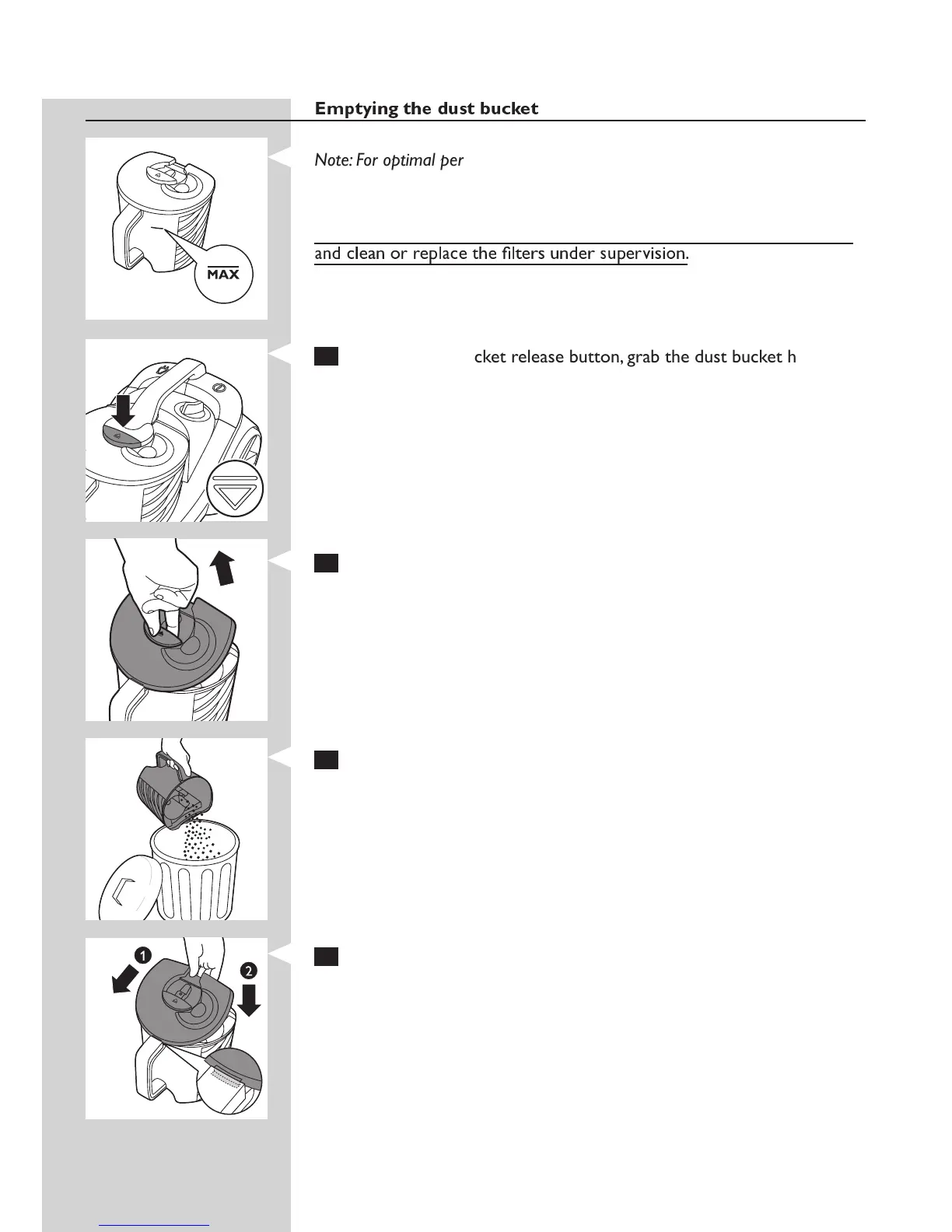 Caution: Children are only allowed to empty and clean the dust bucket