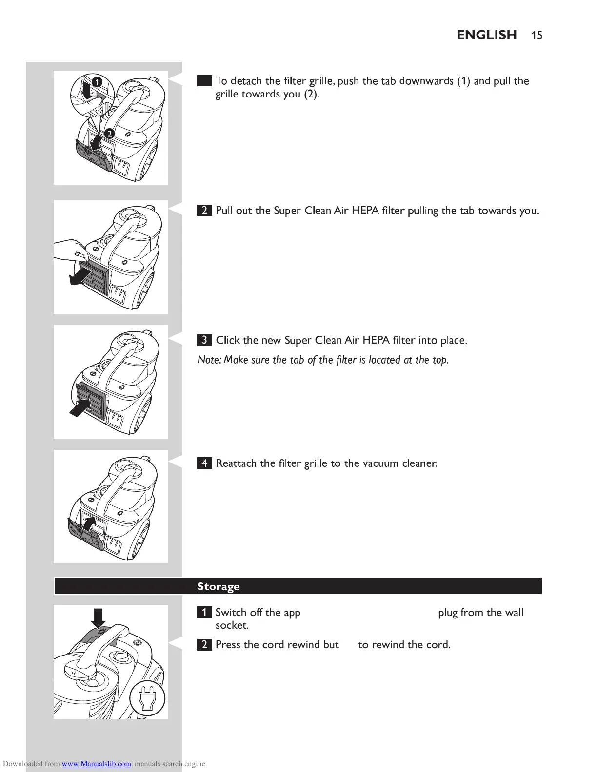 2 Press the cord rewind button to rewind the cord.