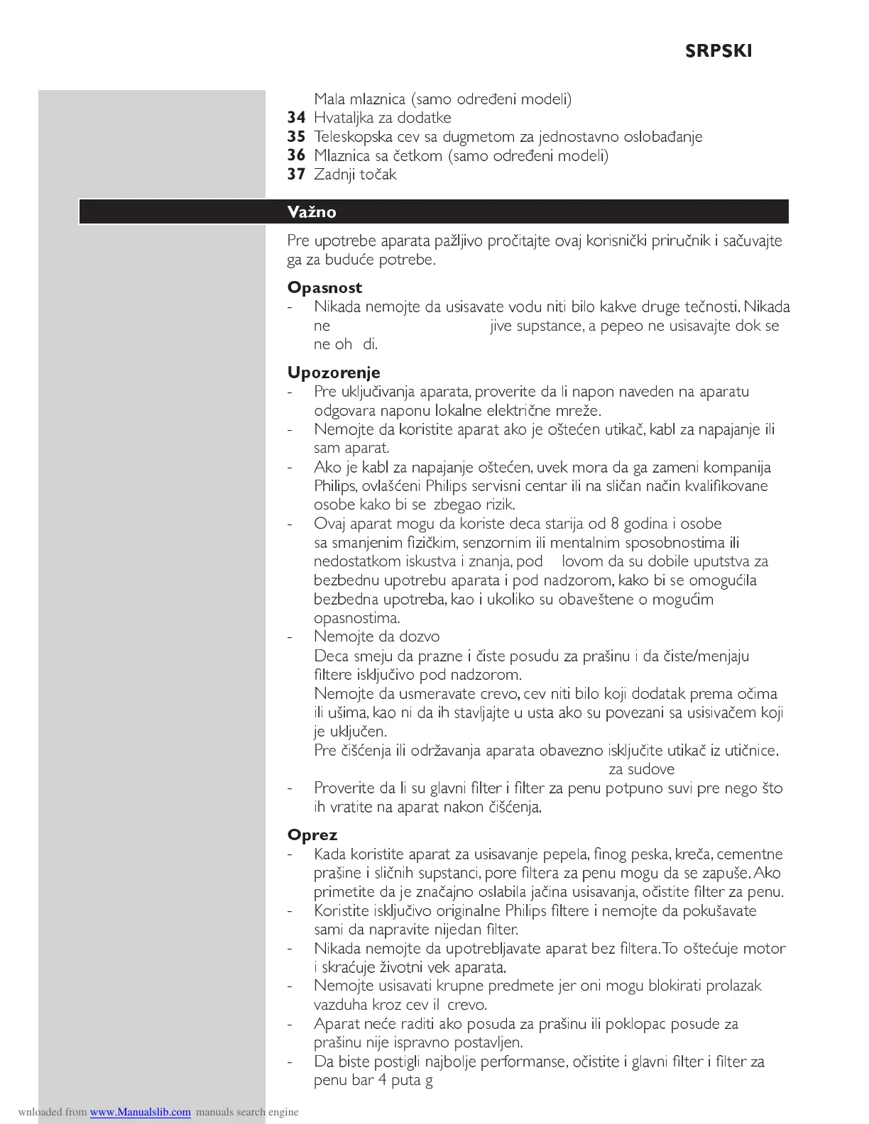 - Nemojte usisavati krupne predmete jer oni mogu blokirati prolazak