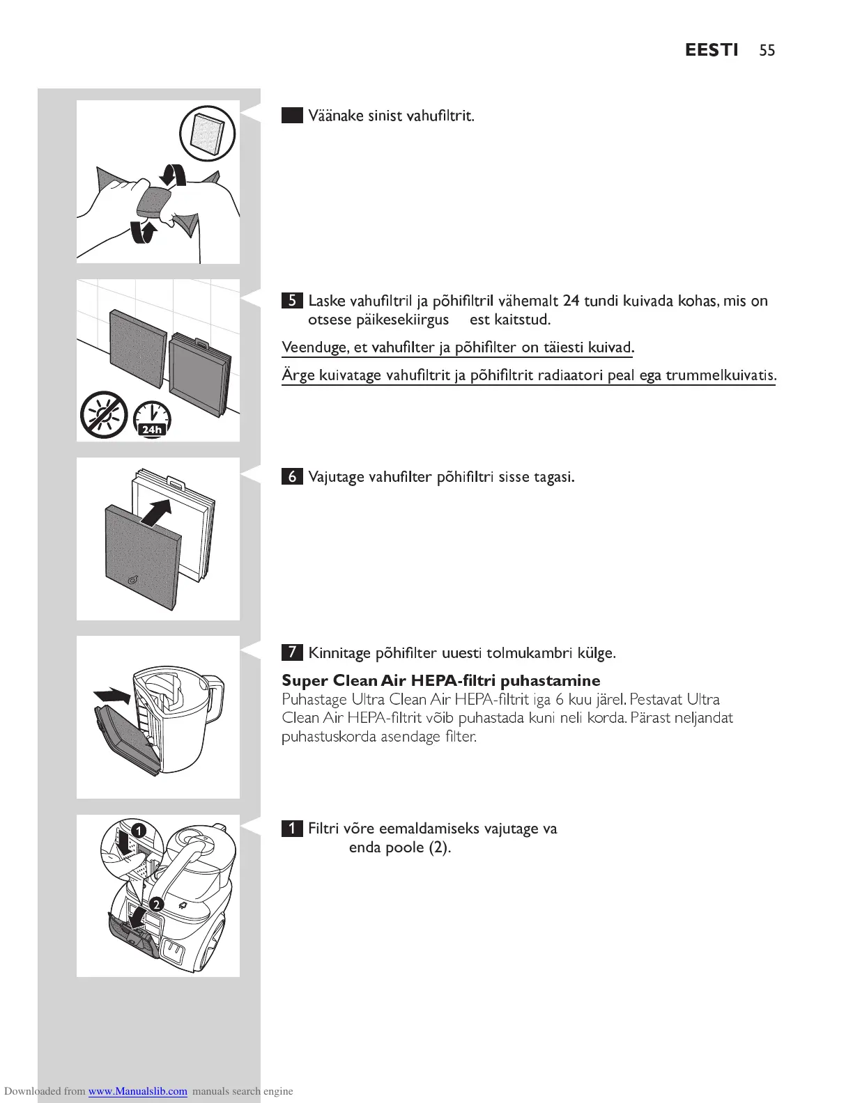 1 Filtri võre eemaldamiseks vajutage vabastussakk alla (1) ja tõmmake