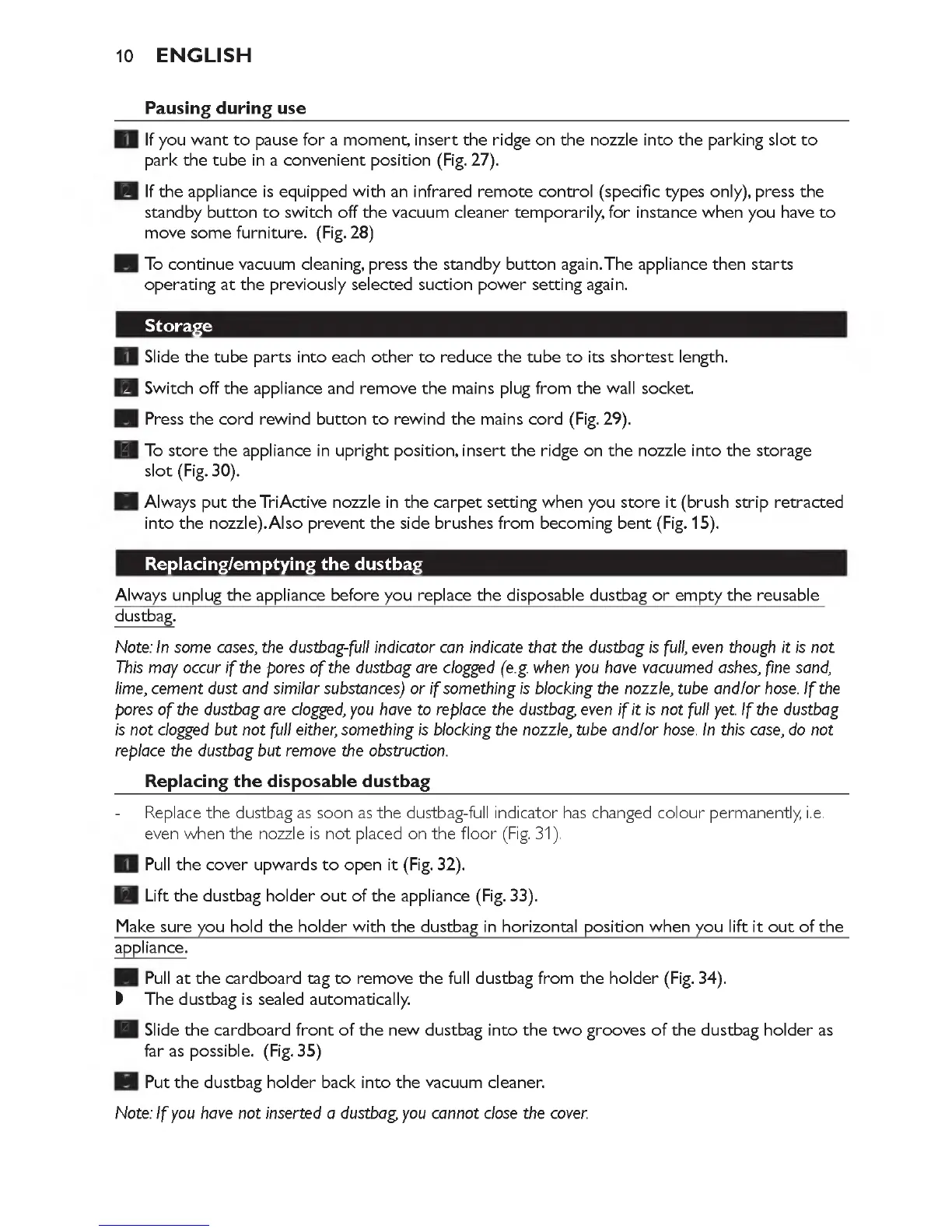 3 Pull at the cardboard tag to remove the full dustbag from the holder (Fig. 34).