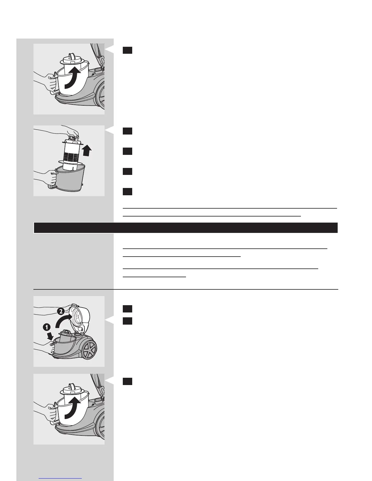 върху дръжката на кофата за прах (1). Отворете капака (2).