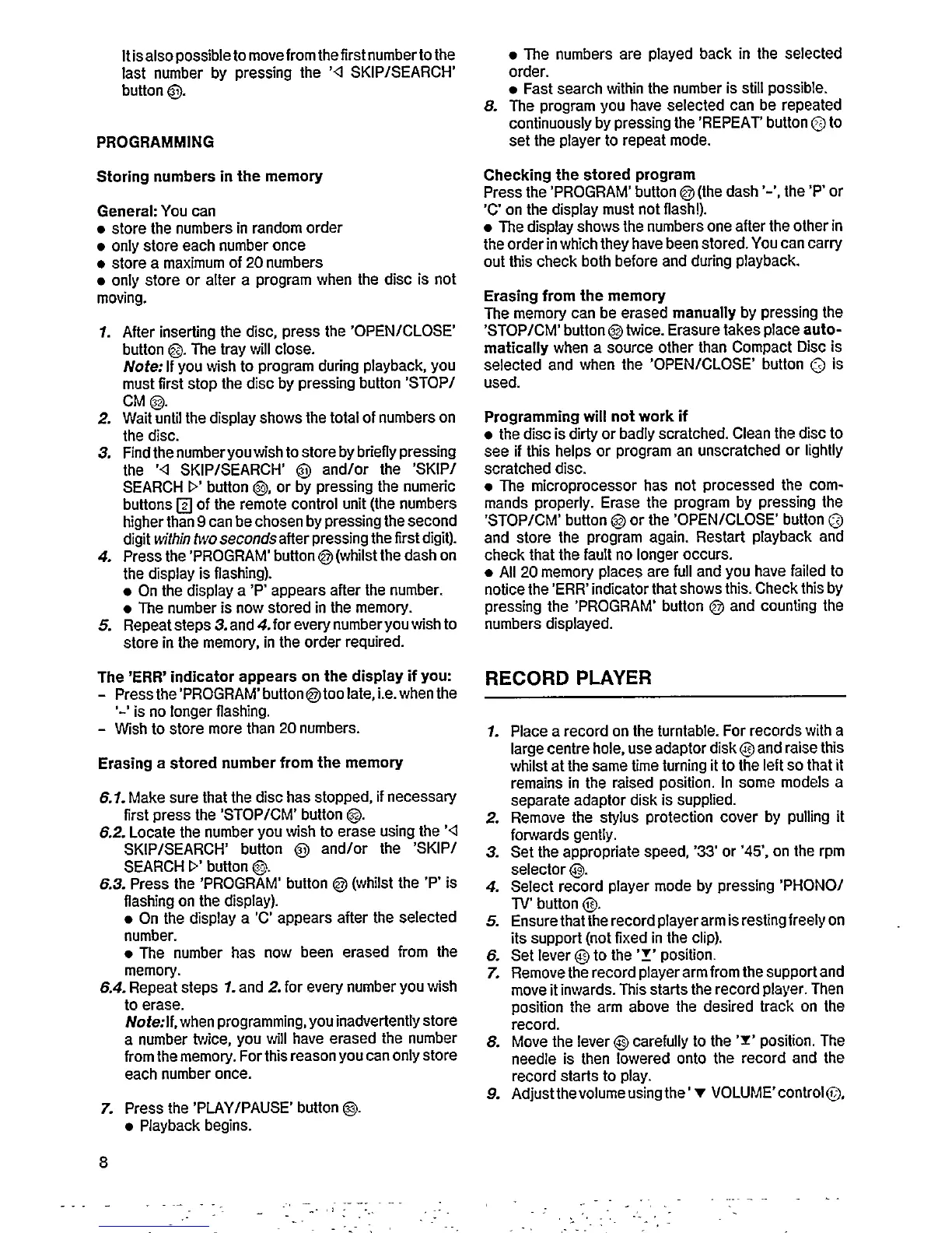 Philips FCD 485 - CD PLAYER PROGRAMMING; Storing and Managing CD Tracks; RECORD PLAYER OPERATION; Record Player Setup and Operation