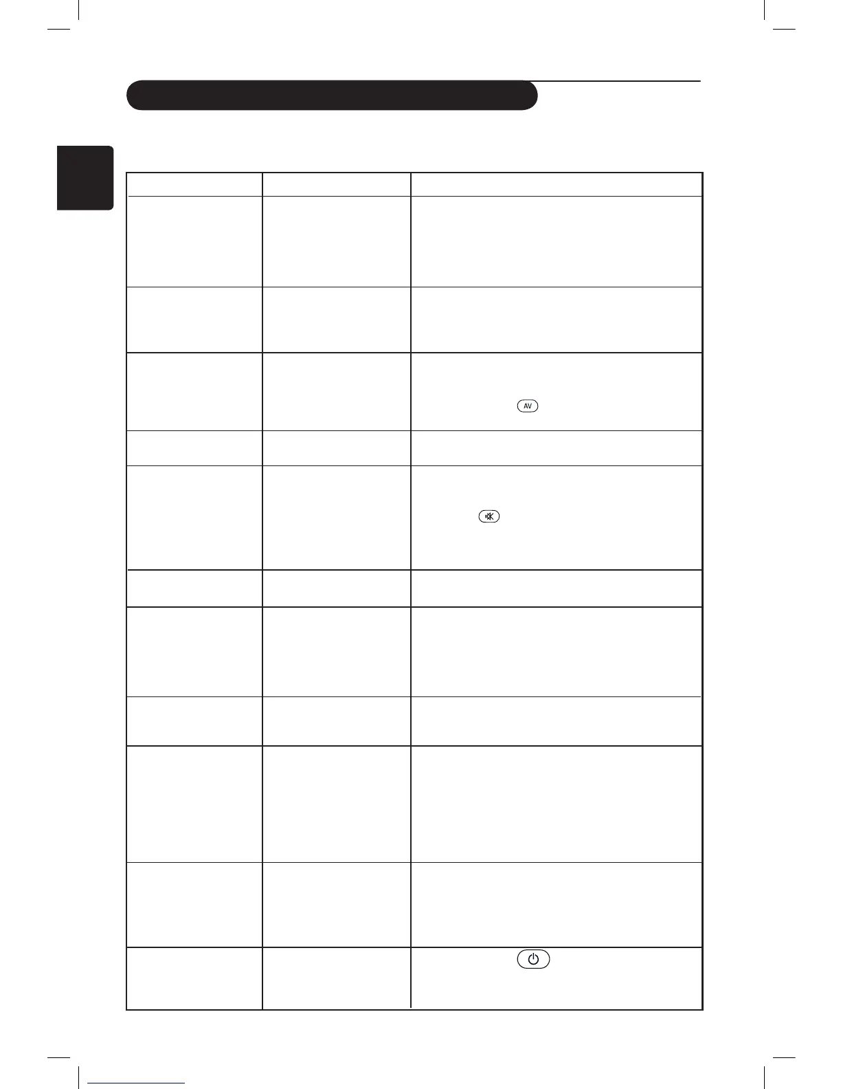 Pas d’affichage • Alimentation électrique • Vérifiez si le cordon d’alimentation est correctement