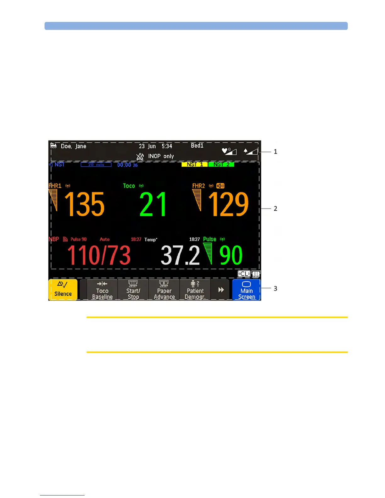 measurement numerics, screen keys, information fields, status indicators, alarms fields, and menus.