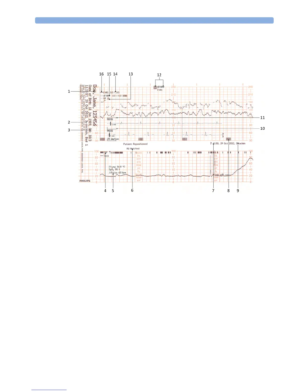 the patient ID, patient date of birth, the current date and time, patient's bed label, and the gestational