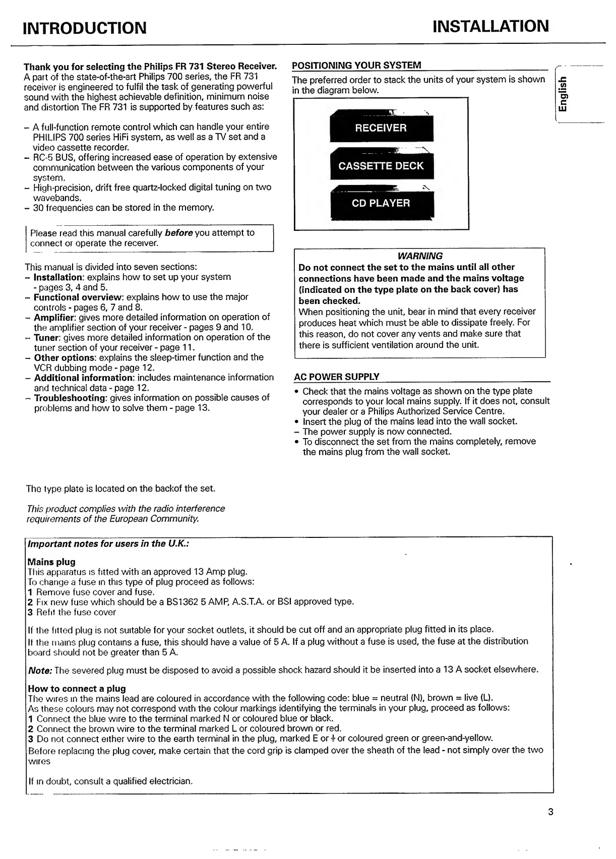Philips FR 731 - Installation Guide; Positioning Your System; AC Power Supply Setup; UK Plug Specifics