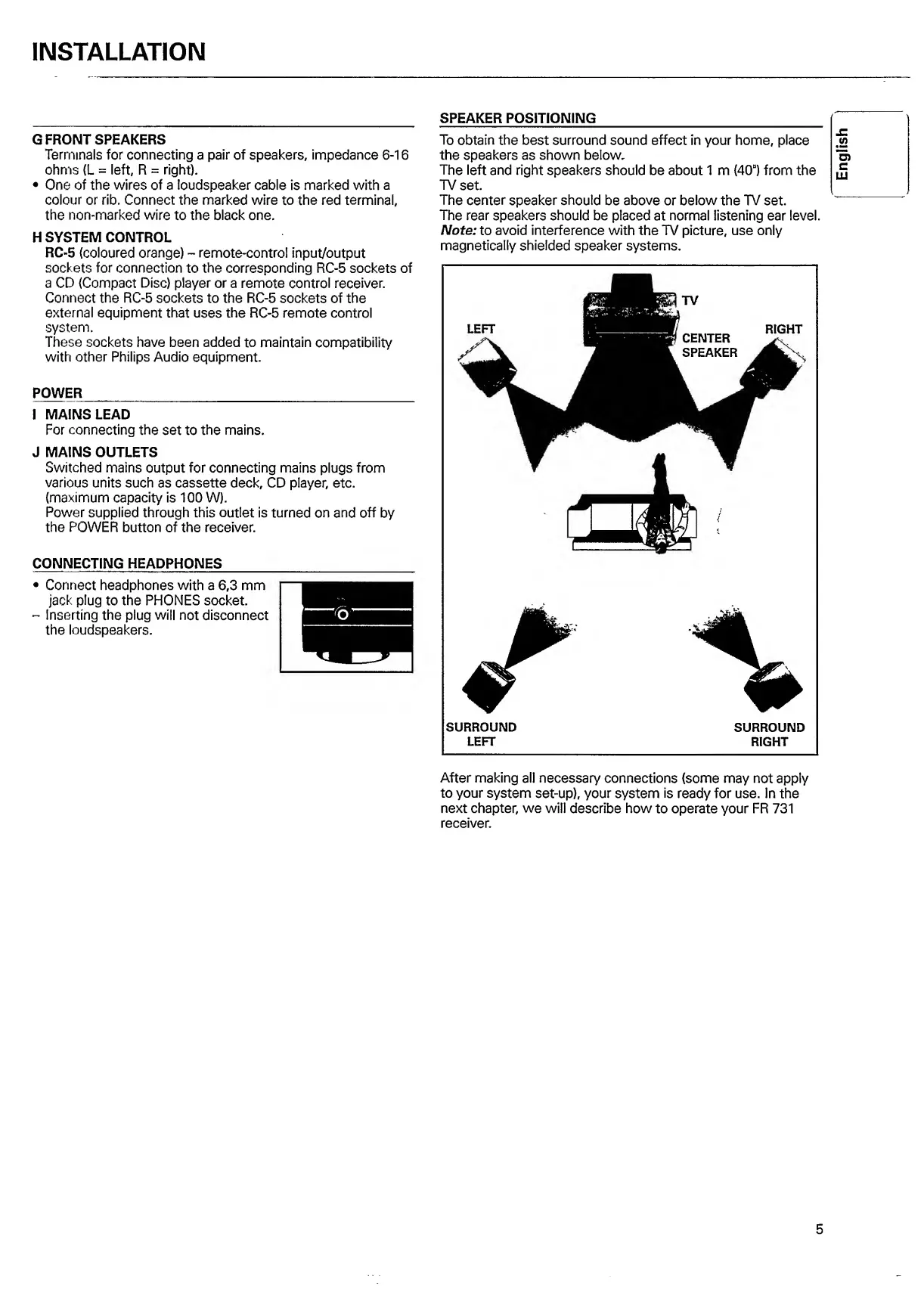 Philips FR 731 - Front Speaker and System Control; Power Outlets and Headphone Jack; Speaker Positioning Guide