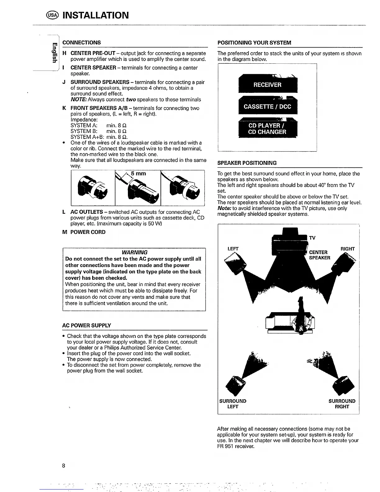 Philips FR 951 - Positioning Your System; Speaker Positioning; AC Power Supply