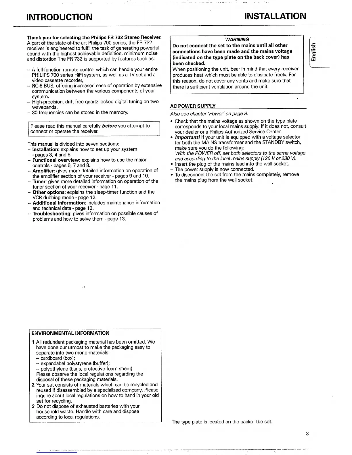 Philips FR732/00 - Introduction; Safety Warnings; AC Power Supply; Environmental Information