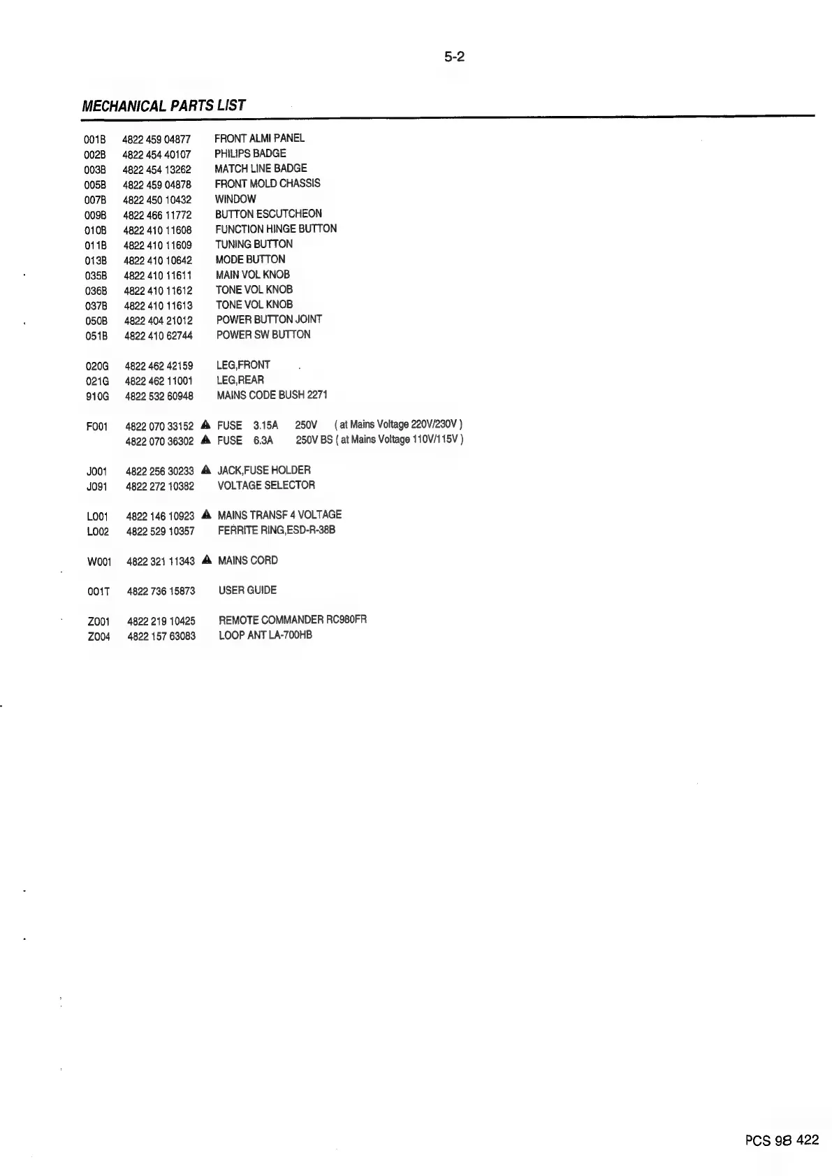 Philips FR980 - MECHANICAL PARTS LIST