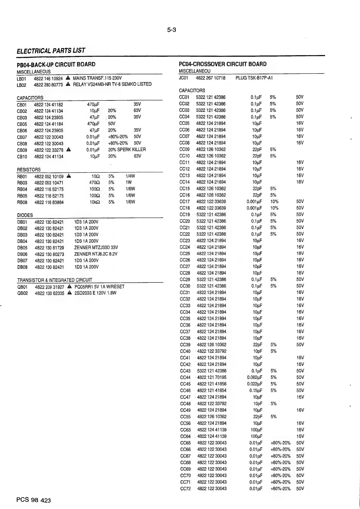 Philips FR980 - ELECTRICAL PARTS LIST; Capacitors; Resistors; Diodes