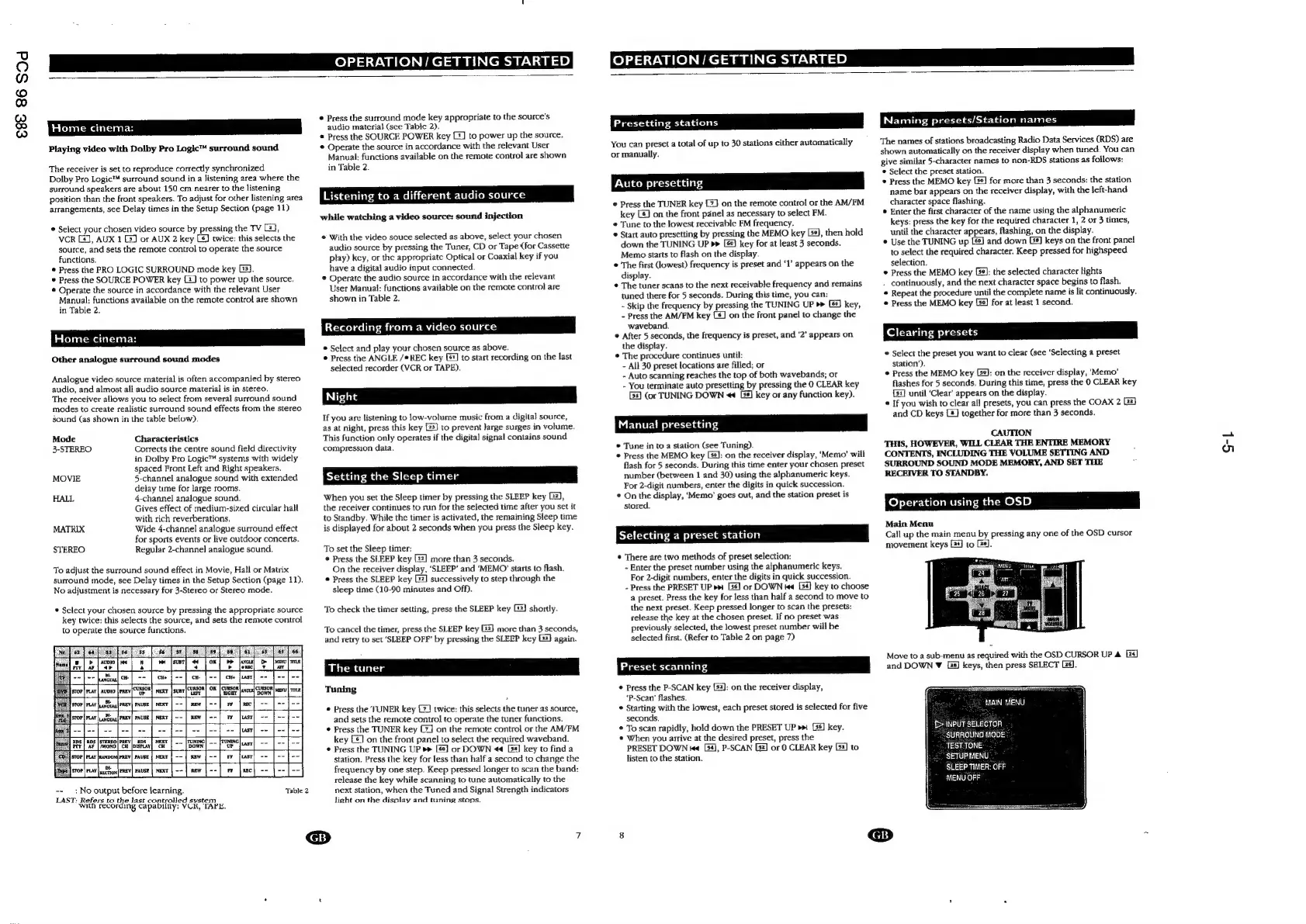 Philips FR980 - Home cinema: Other analogue surround sound modes; Setting the Sleep timer; Presetting stations; Operation using the OSD