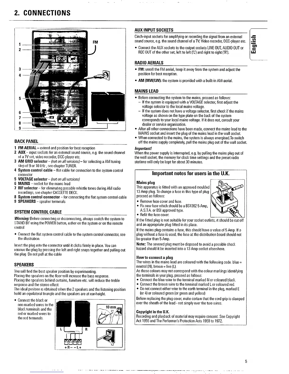 Philips FW 11 - Connections; Back Panel; System Control Cable; Speakers