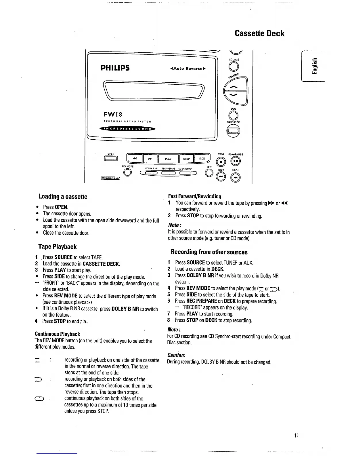 Philips FW 18 - Cassette Deck Operations; Loading a Cassette; Tape Playback; Fast Forward;Rewinding