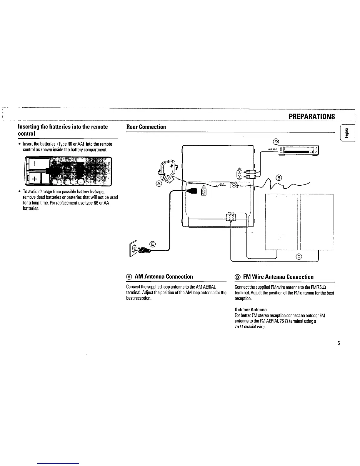 Philips FW 315C - Preparations; Inserting the Batteries into the Remote Control; Rear Connection; AM Antenna Connection