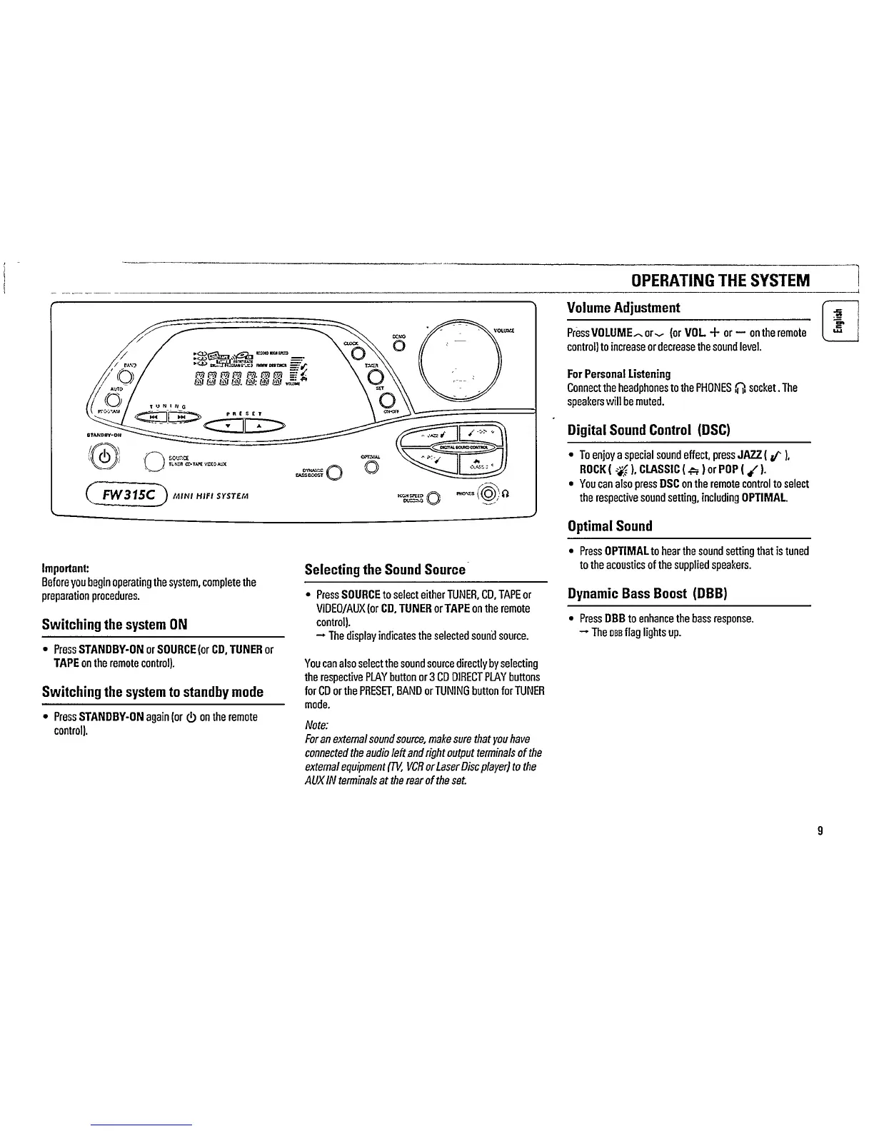 Philips FW 315C - Switching the System on; Switching the System to Standby Mode; Selecting the Sound Source; Volume Adjustment