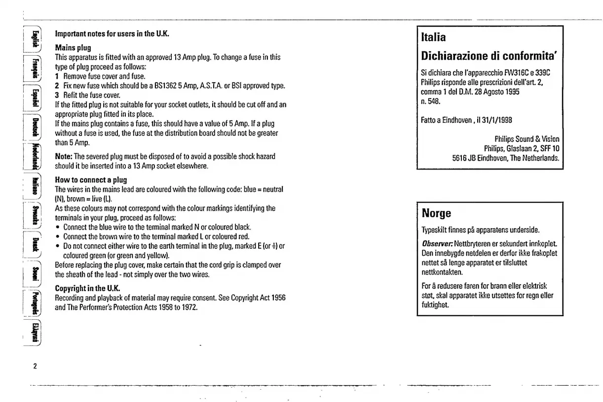Philips FW 316C - Important Notes and Safety Information; UK User Notes: Mains Plug and Copyright