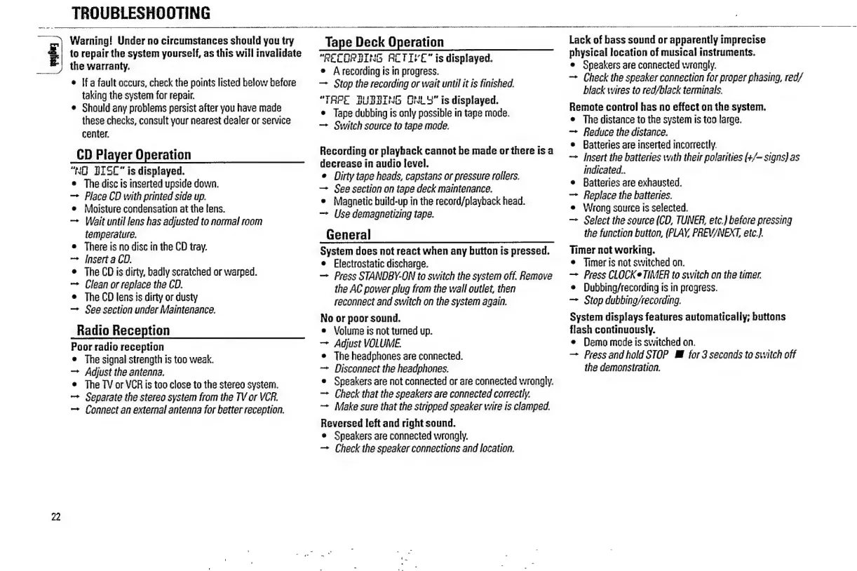 Philips FW 316C - Troubleshooting Common Issues; CD Player and Radio Reception Problems; Tape Deck and General System Malfunctions; Remote Control and Timer Malfunctions