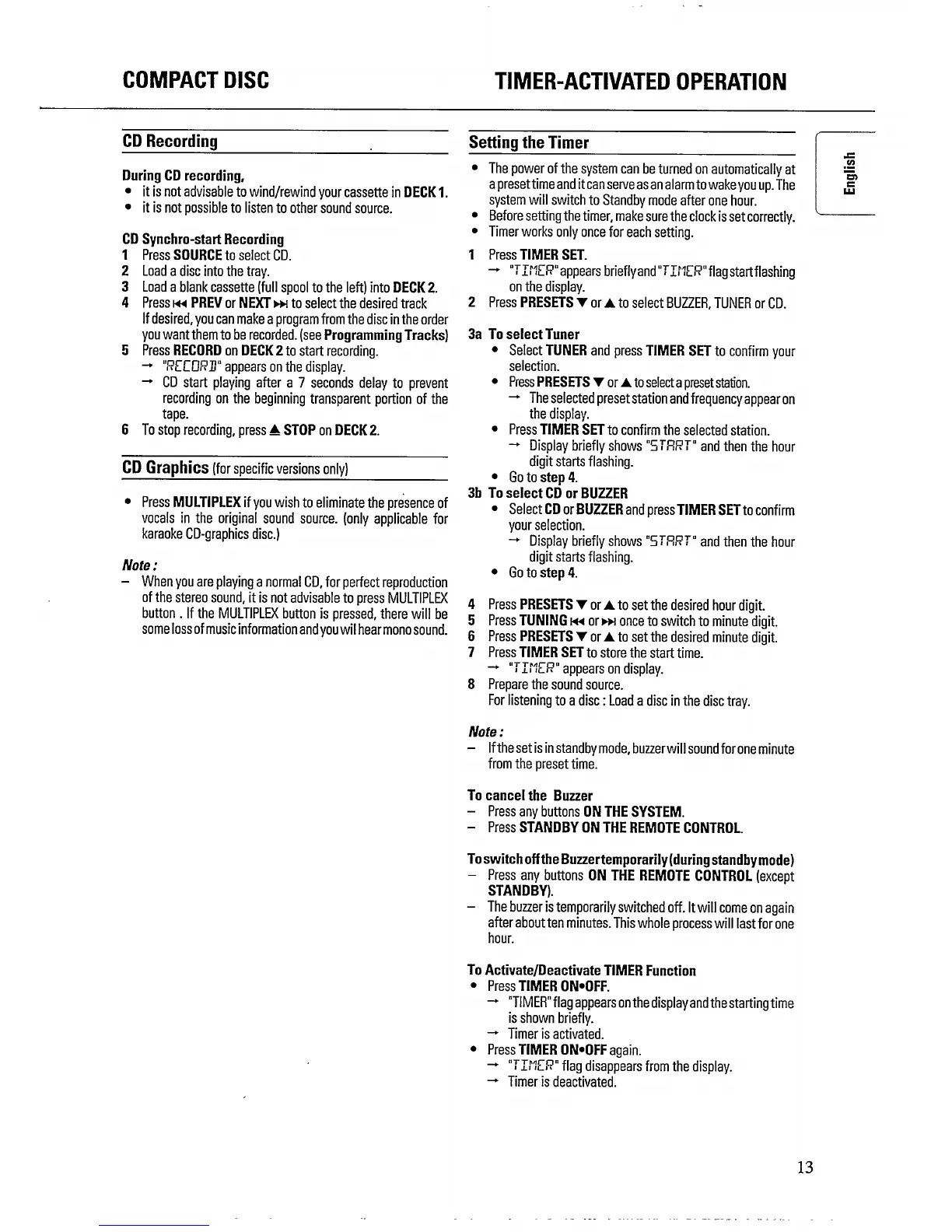 Philips FW 330 - Advanced CD and Timer Functions; CD to Cassette Recording; Setting Up Timer-Activated Operation