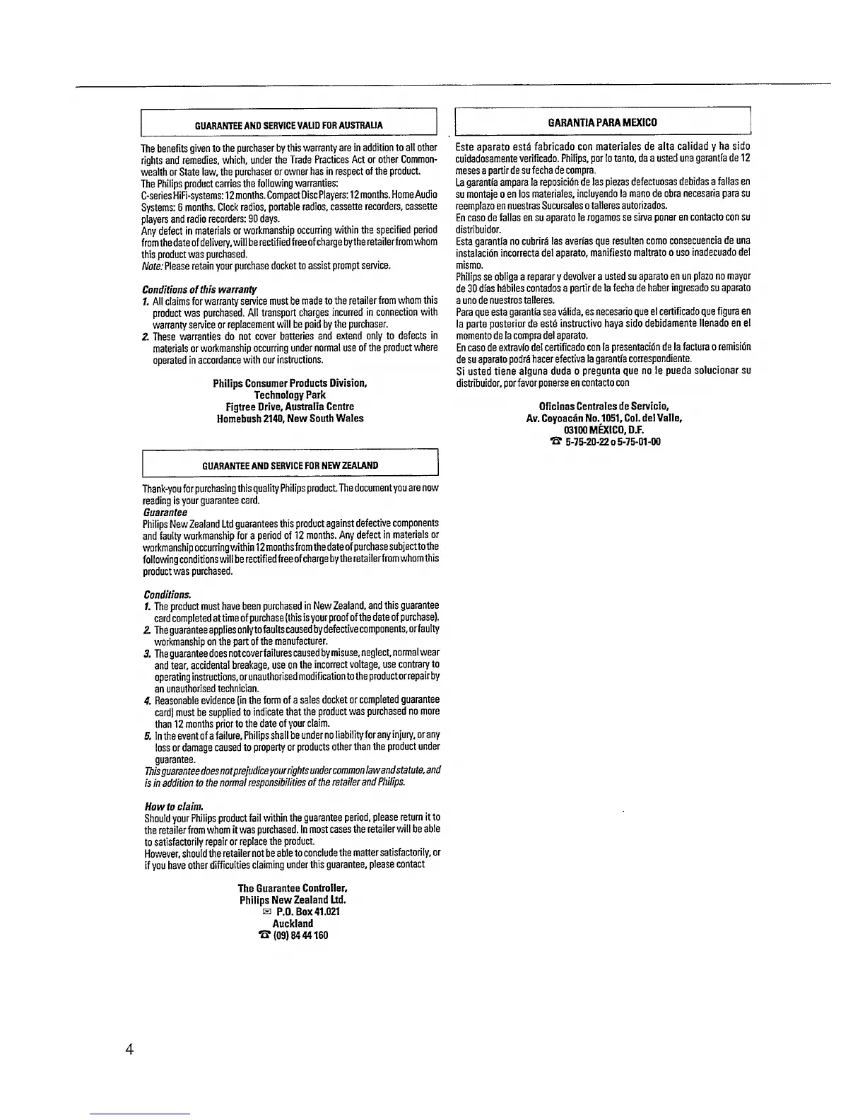 Philips FW 330 - Product Guarantees and Service; Australian Warranty Details; New Zealand Warranty Details