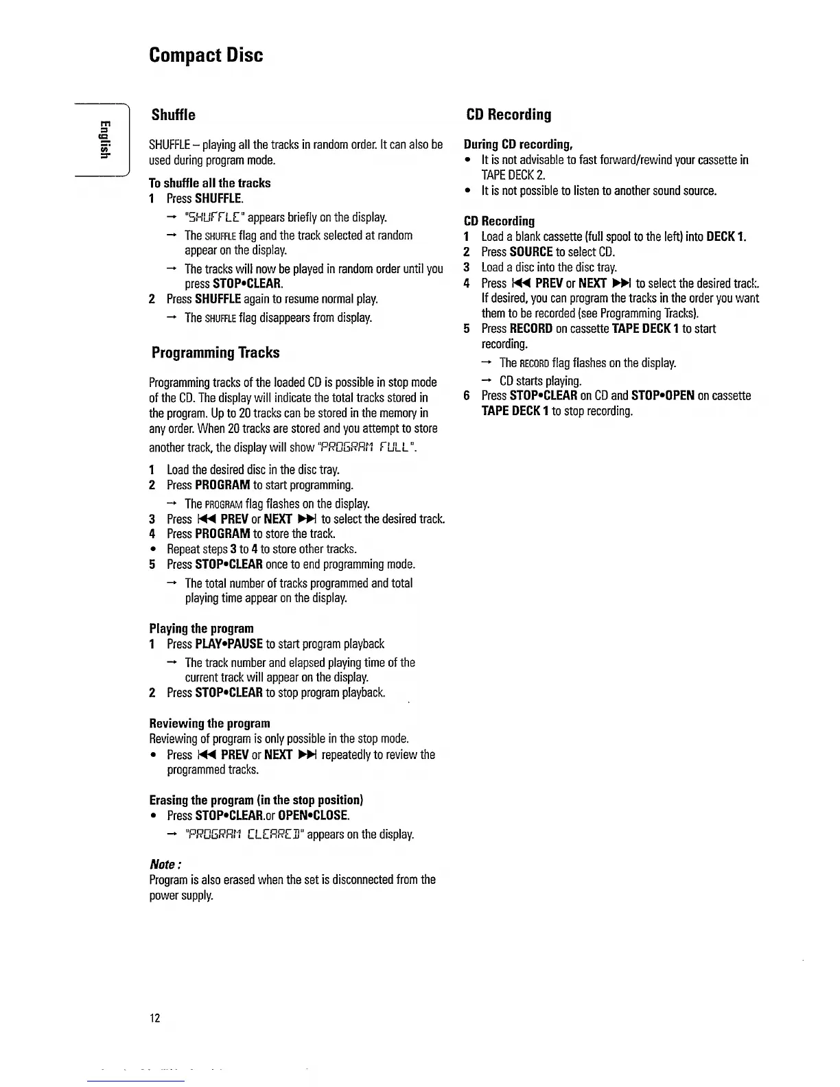 Philips FW 332 - Shuffle Playback; Programming Tracks; CD Recording