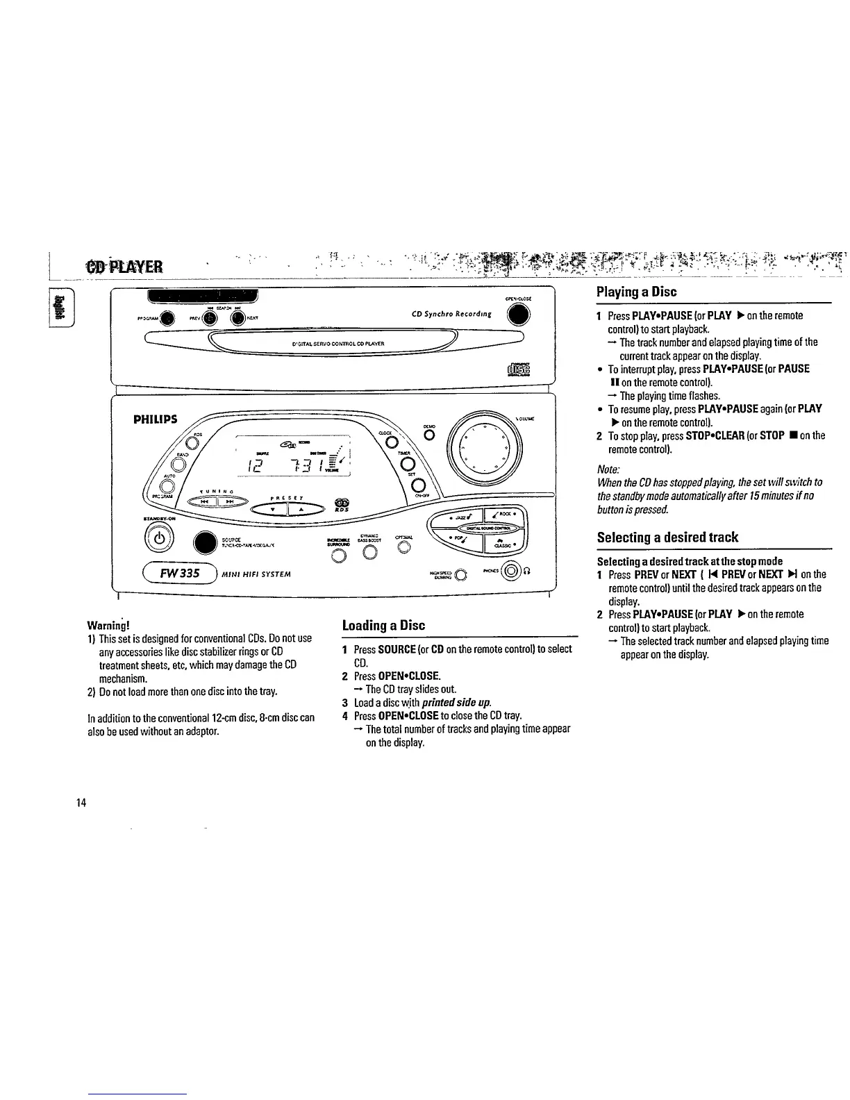 Philips FW 335 - CD Player Operations; CD Disc Loading Procedure; CD Disc Playback Guide; Selecting Specific CD Tracks