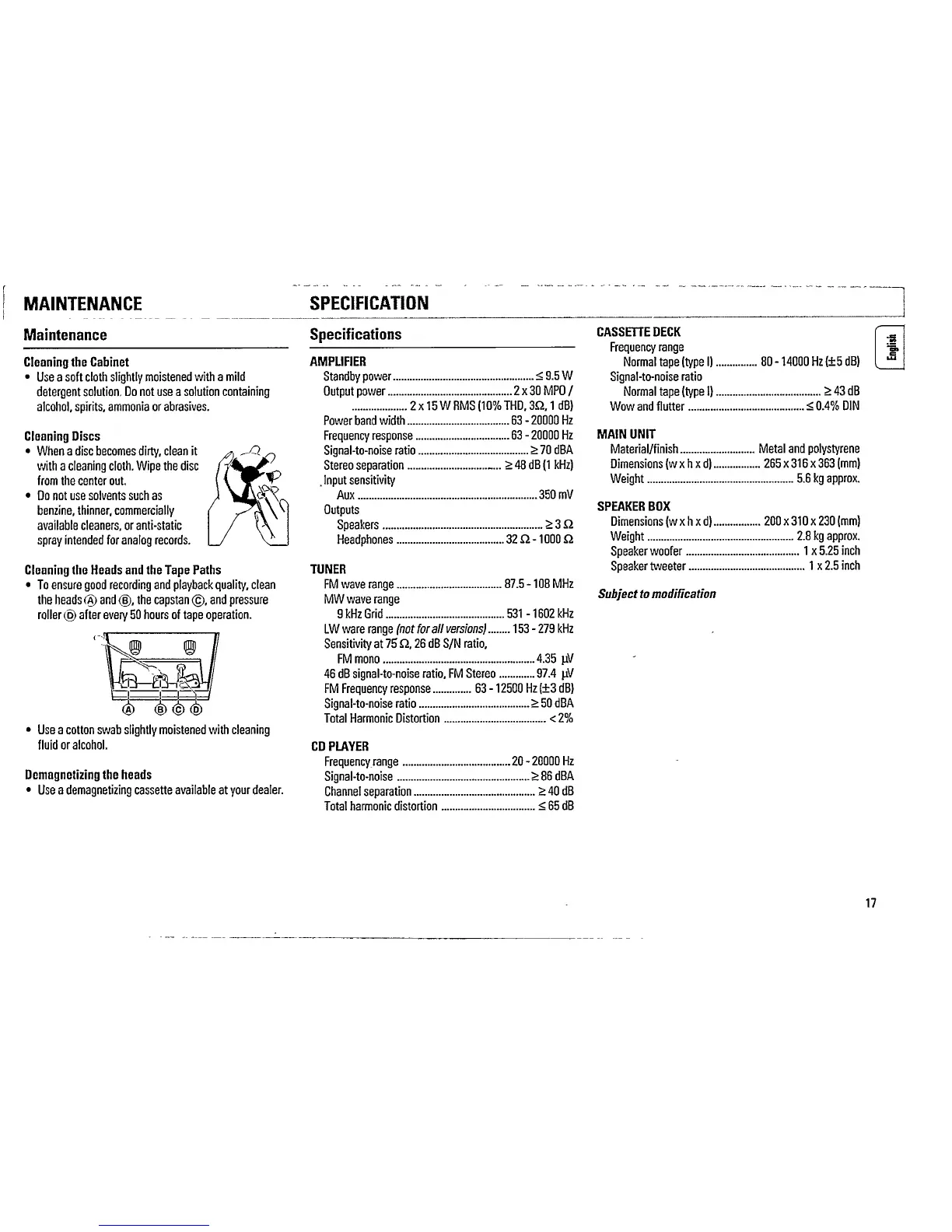 Philips FW 335 - System Maintenance and Cleaning; Component Cleaning Procedures; Tape Head Maintenance; Technical Specifications