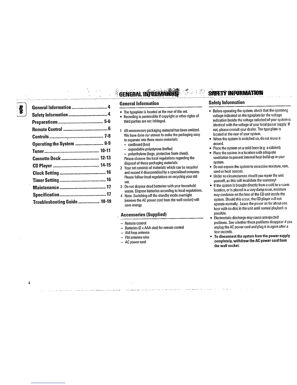 Philips FW 335 - System General Information; Packaging, Recycling, and Disposal; Energy Saving Tips; System Safety Precautions