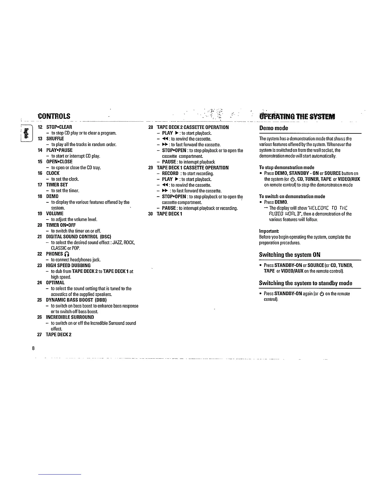 Philips FW 335 - Control Functions Explained; Cassette Deck Operation Modes; System Settings and Special Modes