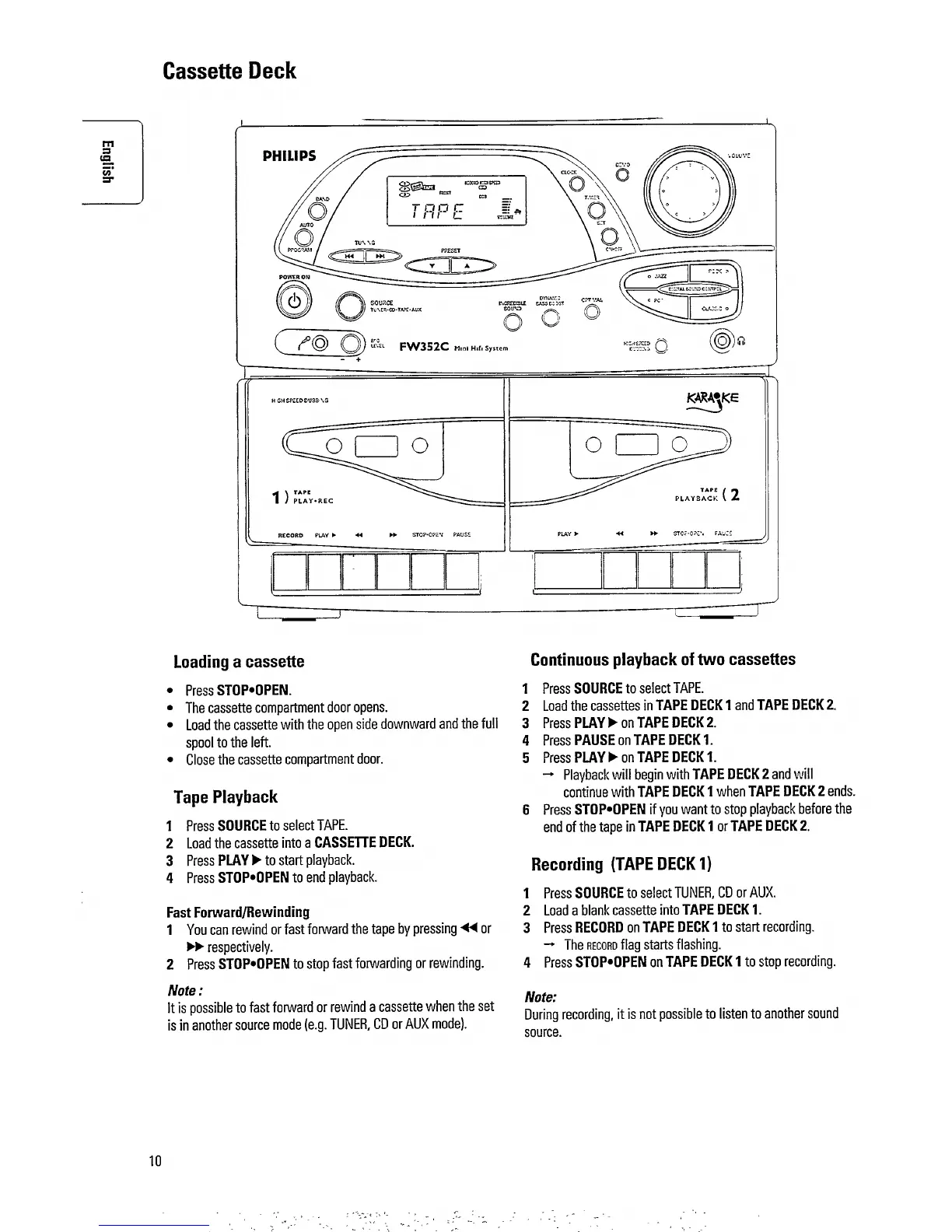 Philips FW 352C - Cassette Deck Operations; Tape Playback and Navigation; Recording Audio to Tape