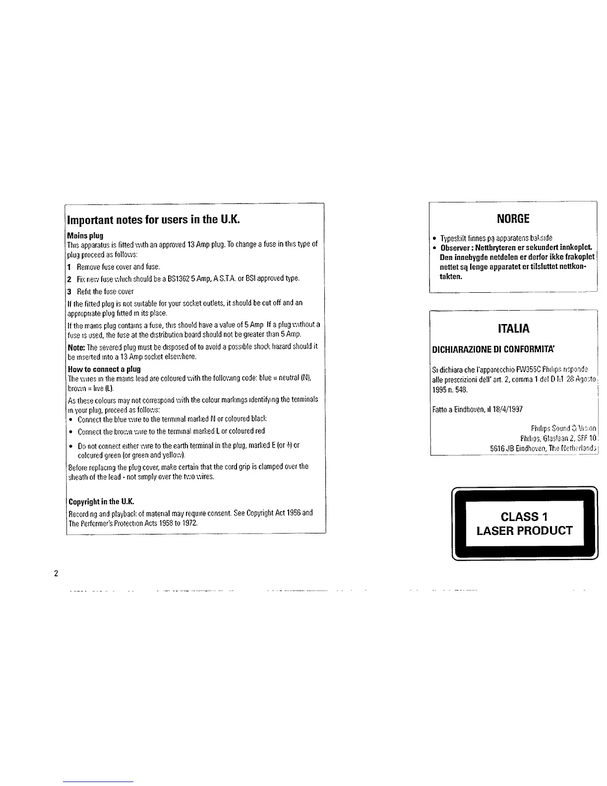 Philips FW 355C - Important Notes for UK Users; Mains Plug Safety; Plug Connection Guide