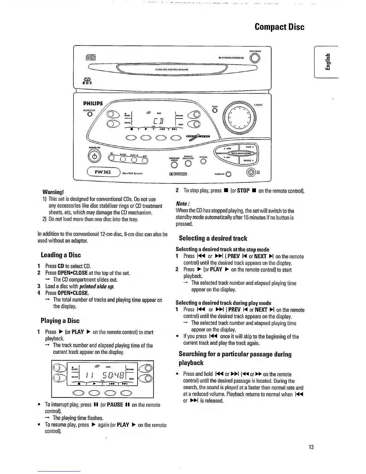Philips FW 362 - Compact Disc (CD) Operations; Loading and Playing CDs; Track Selection and Search