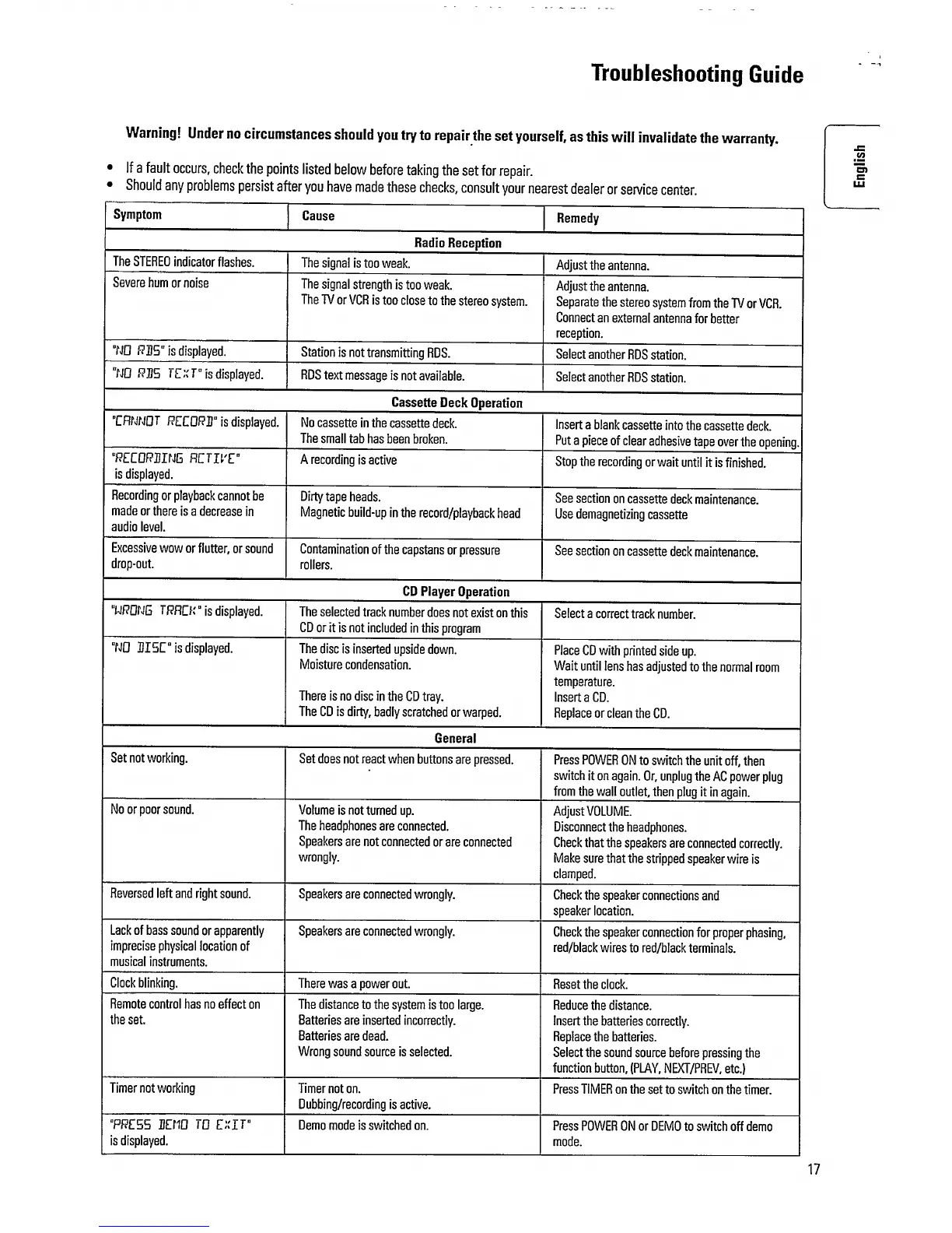Philips FW 362 - Troubleshooting Guide; Radio and Cassette Troubleshooting; CD Player and General Issues