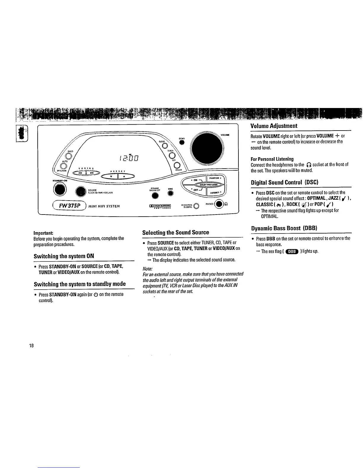 Philips FW 375P - Basic System Operations; Powering On;Off and Standby; Source Selection and Volume