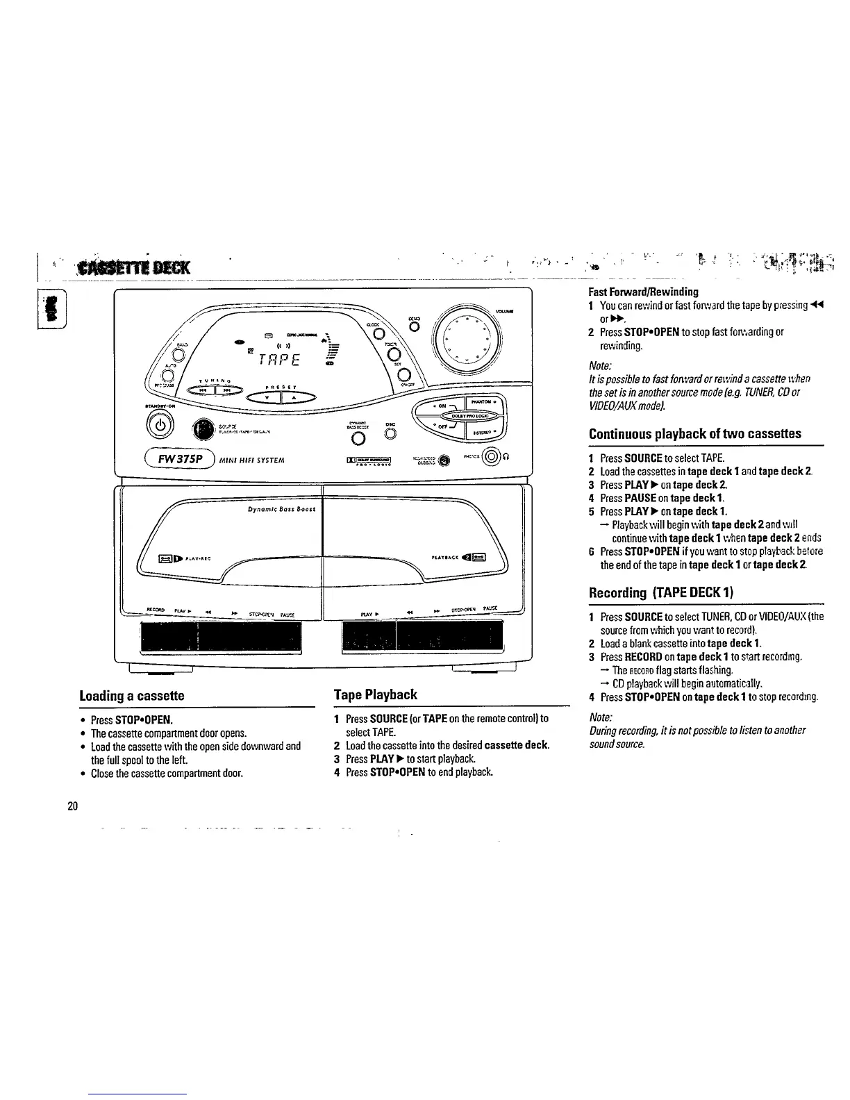 Philips FW 375P - Cassette Deck; Loading a Cassette; Tape Playback; Recording